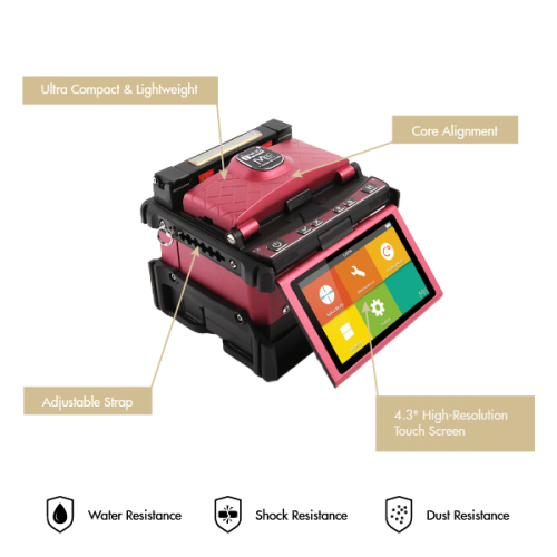 M9, a core-alignment splicer with ultra-portable design, is one of the most efficient fusion splicers in the market. This compact and sophisticated fusion splicer inherits many remarkable functionalities from sister products. M9’s 4.3 inch high-resolution color LCD touch screen with user-friendly intuitive GUI(Graphic User Interface) offers large and clear fiber images to users. By double-tapping the screen, users can enlarge / reduce the screen up to 400X and check the optical fiber with clear images. With M9’s Adjustable strap hanger users can customize their working station. M9 is genuinely world’s most efficient hand-held fusion splicer in the telecommunications industry.